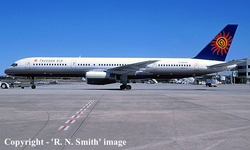 On This Day - December 08, 1995. New Zealand's Freedom Air International operated its inaugural service from Auckland (New Zealand) to Sydney (Kingsford Smith) using the leased Boeing 757-204 G-BYAF. |