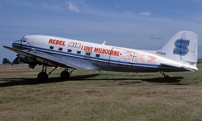 VH-MIN. Rebel Air - in the Setair livery with 'I Love Melbourne' titles at Sydney Airport, July 1983.