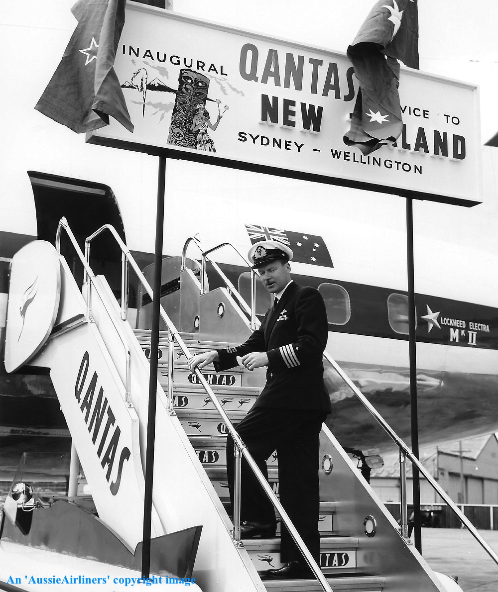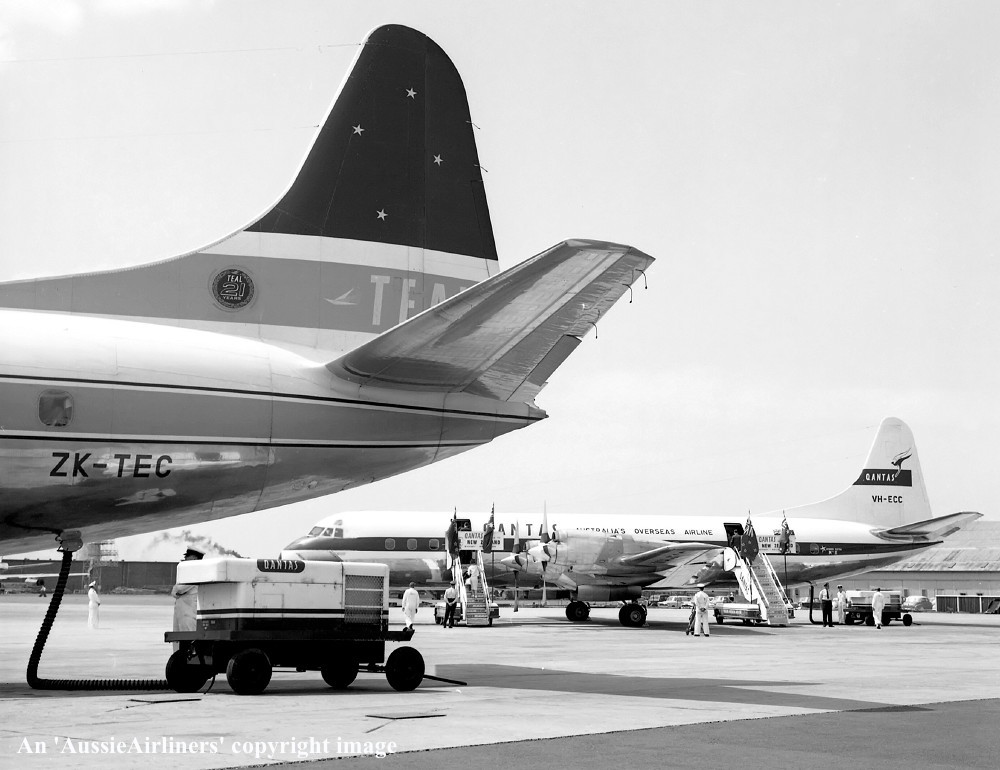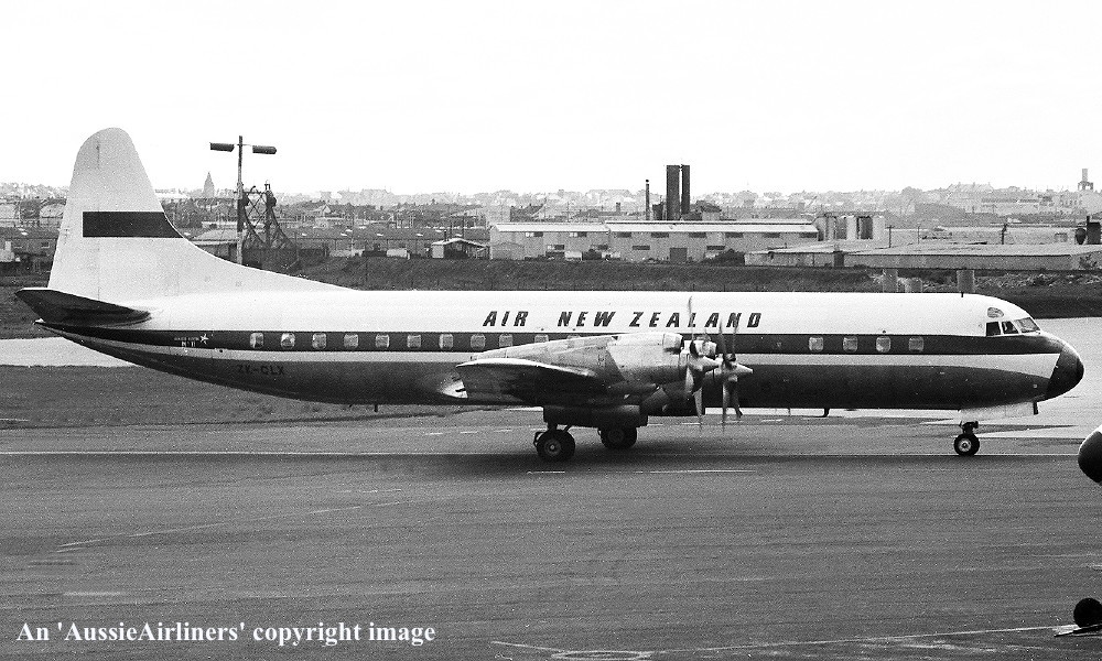 ZK-CLX. Air New Zealand - in the basic Qantas livery at Sydney Kingsford Smith Airport, April 1965. (E. D. Daw Copyright Image 1808-326.) |