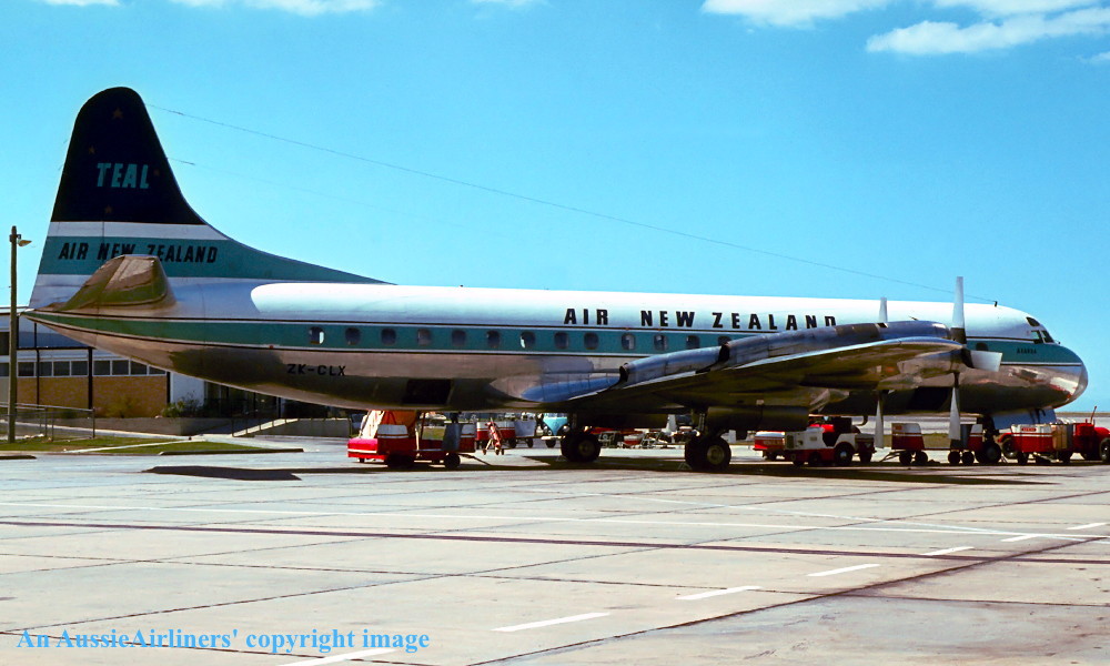 ZK-CLX. TEAL Air New Zealand - 'Akaroa' in the standard livery at Auckland Airport, November 1965. (R. N. Smith Collection Copyright Image 1808-969.) |